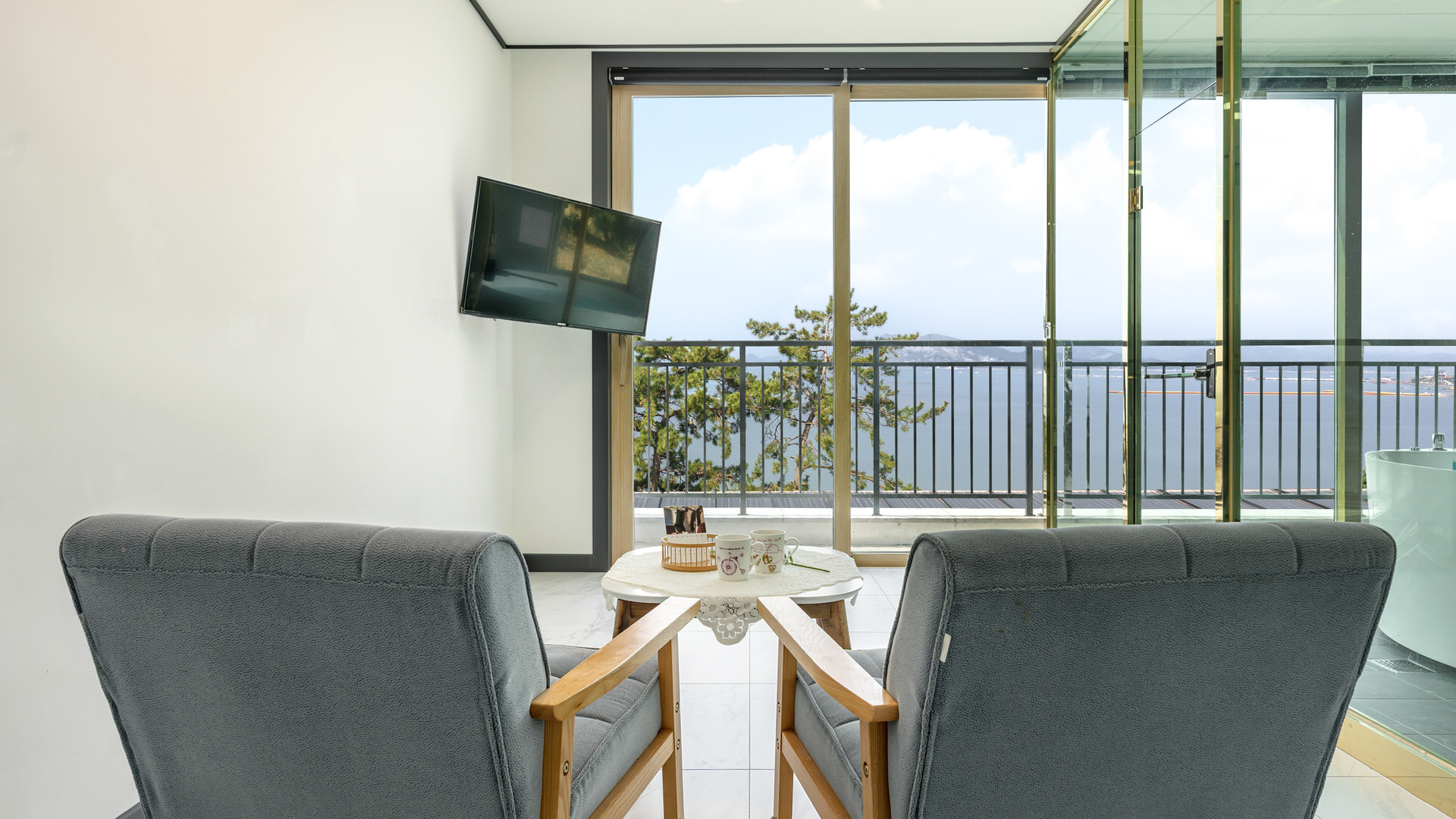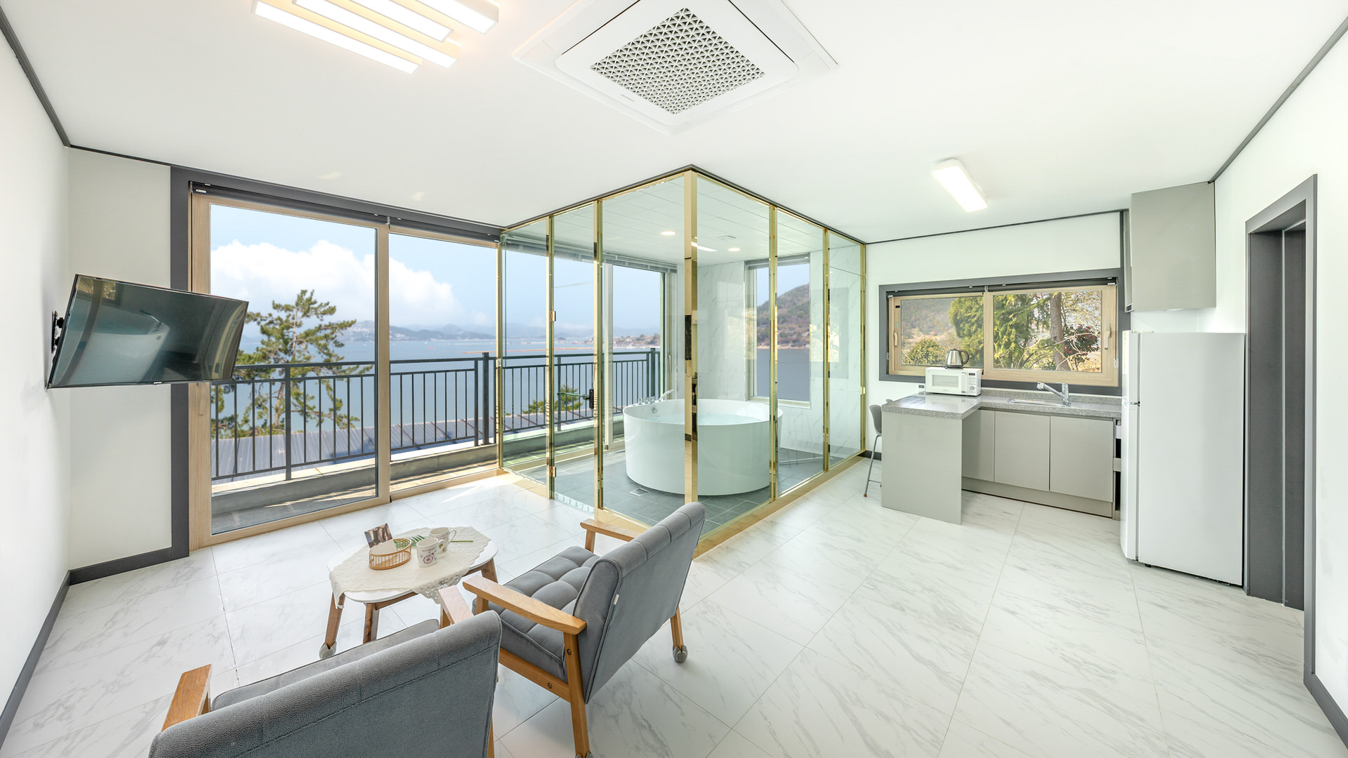 - 집기품목 : 욕실용품, 남녀공용, 금연, 가스레인지, 인덕션, 테라스, 냉장고, 드라이기, 에어컨, 식탁, 전기밥솥, 취사시설/도구, 커피포트, 전자레인지, 타월, TV, 스파/월풀, 바다전망